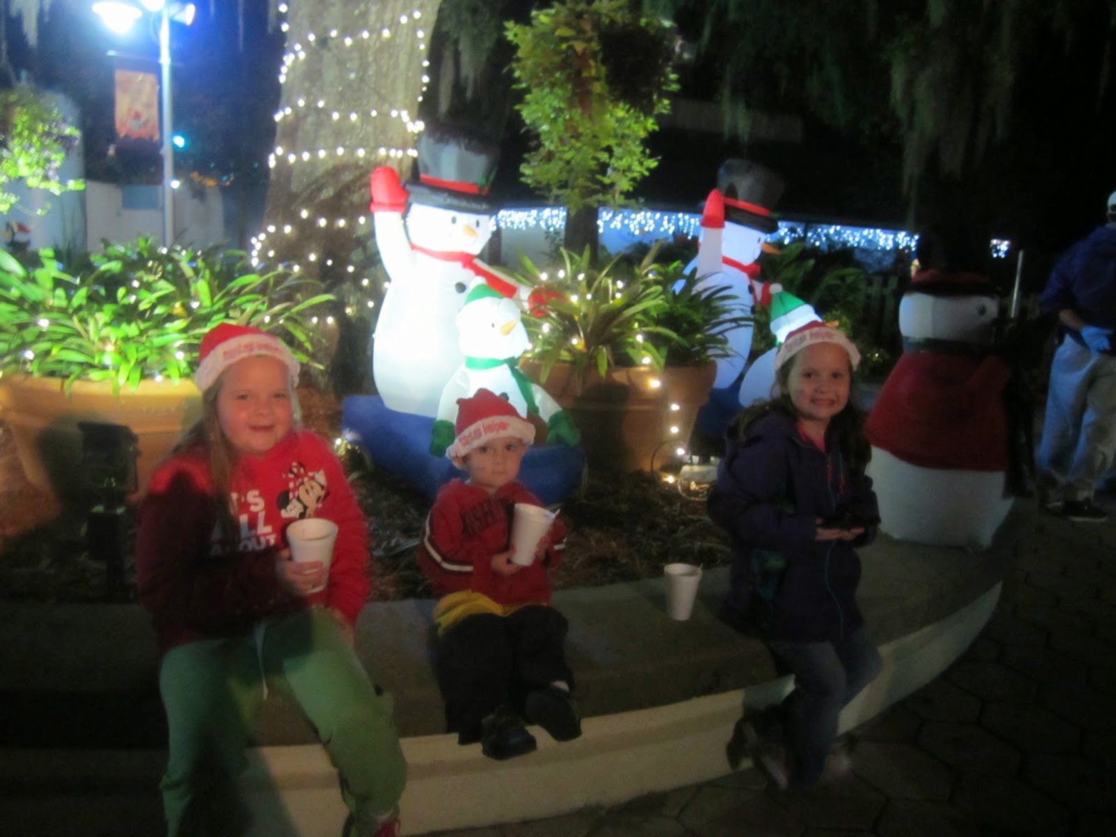 They played some fun Christmas Games and danced with the characters in the Village square. They had a tree lighting ceremony, and everyone sat as they read "Twas the Night Before Christmas!" It even started to snow (little bubbles) again! We had a drink of Hot cocoa and soaked in the magic of the evening!